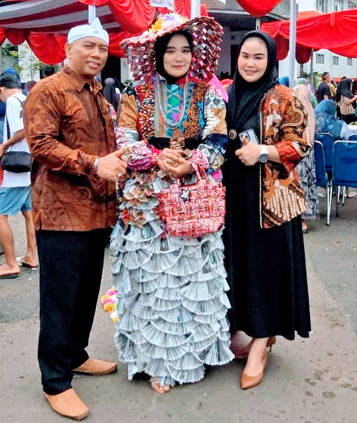 Busana yang ditampilkan bukan sekadar indah dipandang mata, tapi juga sarat pesan lingkungan. Gaun spektakuler tersebut dirancang dengan penuh kreativitas dari berbagai bahan limbah rumah tangga—mulai dari potongan koran bekas yang dilipat rapi menjadi rok berlayer, kemasan makanan ringan yang disusun membentuk ornamen unik di bagian atas, hingga botol plastik kecil dan kardus yang dijadikan aksesori pelengkap. Bahkan tas tangan pun dibuat dari limbah plastik merah, memperkuat kesan totalitas pada penampilan ini.