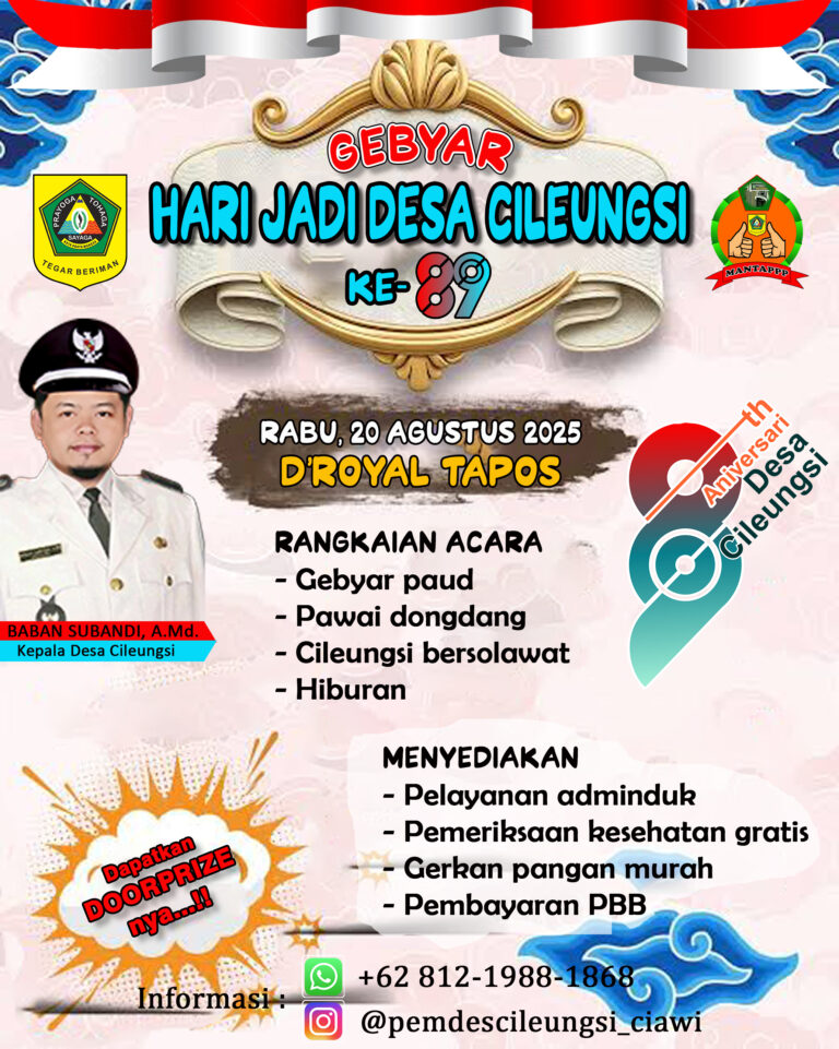 berantas86news | Ciawi Bogor, 3 Agustus 2025 – Pemerintah Desa Cileungsi, Kecamatan Ciawi, Kabupaten Bogor, tengah bersiap menggelar perayaan akbar dalam rangka Hari Jadi Desa Cileungsi yang ke-89. Kegiatan bertajuk Gebyar Hari Jadi Desa Cileungsi ini akan dilangsungkan pada Rabu, 20 Agustus 2025 di area D’Royal Tapos, dan dipastikan akan berlangsung meriah dengan beragam agenda kegiatan untuk masyarakat.
