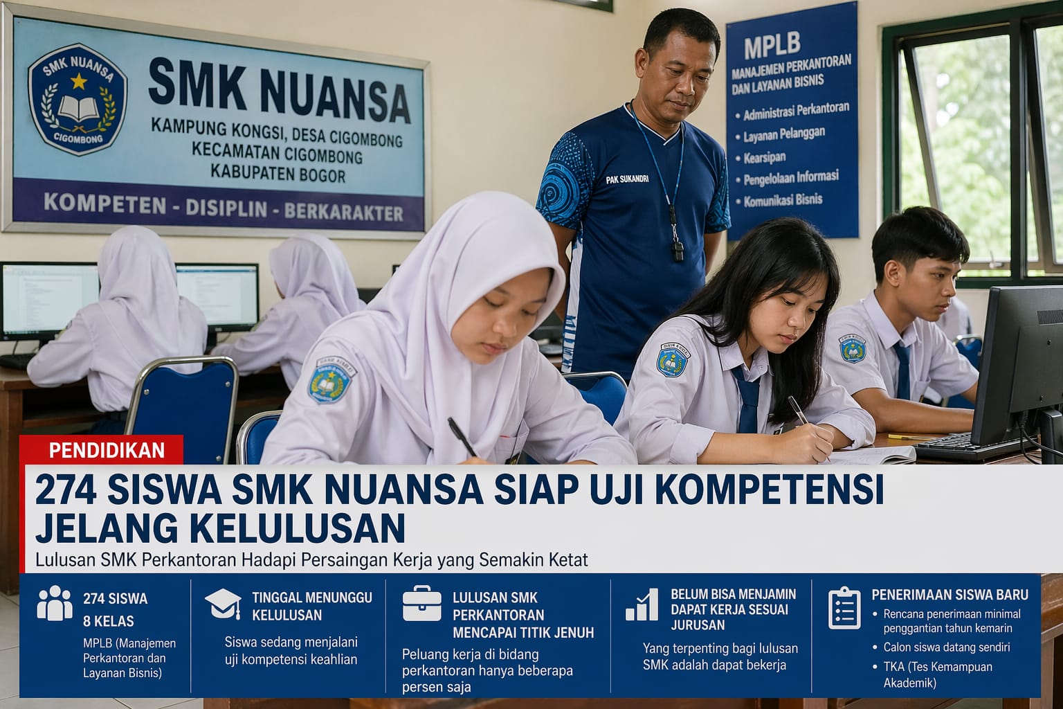 berantas86news | Cigombong Bogor – Jumat, 25/04/2026. Menjelang pengumuman kelulusan, ratusan siswa SMK Nuansa yang berlokasi di Kampung Kongsi, Desa Cigombong, Kecamatan Cigombong, Kabupaten Bogor, tengah menyelesaikan tahapan akhir pendidikan melalui uji kompetensi keahlian. Tahun ini, sebanyak 274 siswa dari 8 kelas jurusan Manajemen Perkantoran dan Layanan Bisnis (MPLB) bersiap memasuki dunia kerja yang semakin kompetitif.