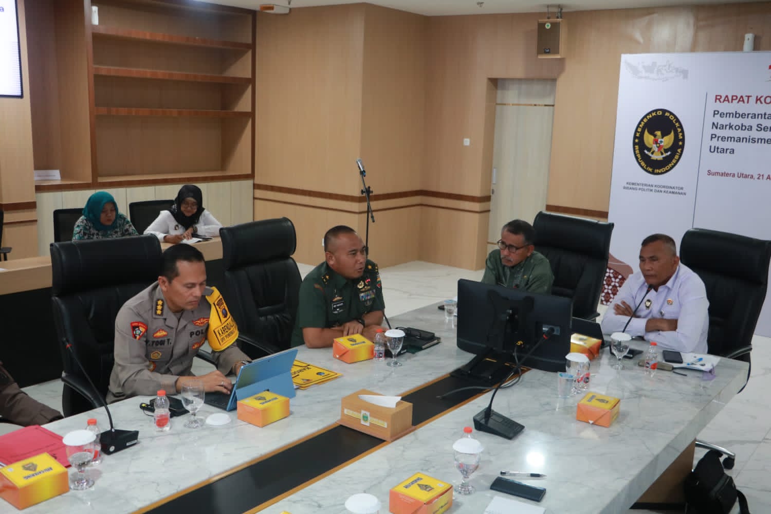 Rapat ini dihadiri oleh Staf Khusus Menko Polkam Bidang Politik Luar Negeri Prof. Imron Cottan, Inspektur Kemenko Polkam Gausudin Amin Yusup, Plt. Deputi Bidang Koordinasi Keamanan dan Ketertiban Masyarakat Kemenko Polkam Brigjen Pol. Hery Sasongko, Kasdam I/Bukit Barisan Brigjen TNI Arif Hartoto, perwakilan dari Polda Sumut, perwakilan Pemprov Sumut, Kabagops Binda Sumut, perwakilan Kejaksaan Negeri Medan, dan perwakilan BNNP Sumut. ***