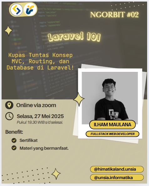 berantas86news | Jakarta, 25 Mei 2025 — Himpunan Mahasiswa Informatika (HIMATIKA) Universitas Siber Asia (Unsia) Jakarta kembali menghadirkan forum berbagi ilmu bertajuk Ngorbit #02, yang akan membahas secara mendalam tiga pilar utama dalam pengembangan web menggunakan Laravel: Konsep MVC (Model-View-Controller), Routing, dan Database.