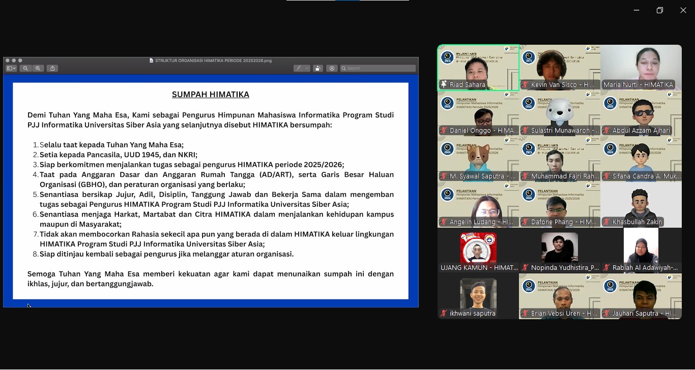 berantas86news | Jakarta, 6 Mei 2025 – Himpunan Mahasiswa Informatika (HIMATIKA) Universitas Siber Asia Jakarta dengan telah dilaksanakannya pelantikan pengurus untuk periode 2025-2026. Acara pelantikan ini diselenggarakan secara daring, mengingat kondisi geografis pengurus HIMATIKA yang berada di lokasi yang sangat berjauhan.