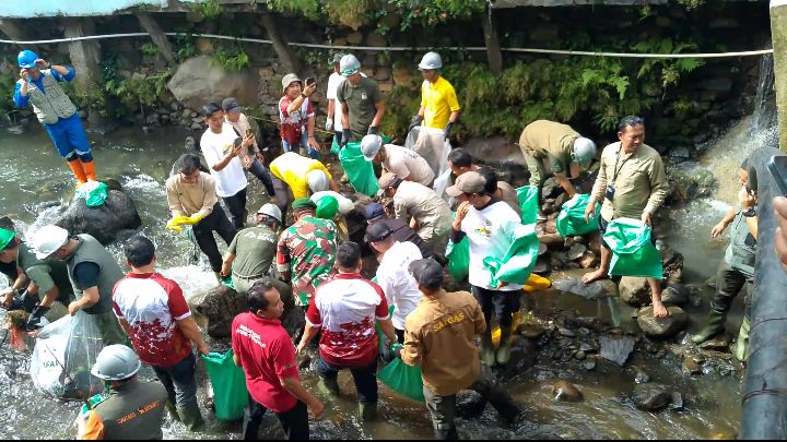 berantas86news | Cisarua, Bogor – Suasana berbeda tampak di kawasan Pasar Cisarua dan aliran Kali Cisarua, Kabupaten Bogor, Jumat (3/10). Ribuan warga, pelajar, komunitas lingkungan, hingga aparat pemerintahan turun bersama membersihkan sungai dalam rangka memperingati Hari Sungai Sedunia 2025. Kegiatan yang berlangsung sejak pagi ini tak hanya berfokus pada pembersihan sungai, tetapi juga pembagian ratusan bibit pohon serta fasilitas tempat sampah untuk masyarakat sekitar.